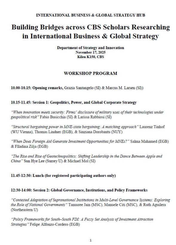 We recognize that many scholars across CBS departments conduct research on international business and global strategy. Building on its ambition to provide a forum for sharing ongoing work and new ideas, and to foster collaboration, the IB&GS Hub at SI invites members of this community to connect, exchange insights, and explore potential partnerships. To this end, the Hub will host a full-day workshop on November 17, 2025, offering an opportunity to present research and engage in constructive discussion.
